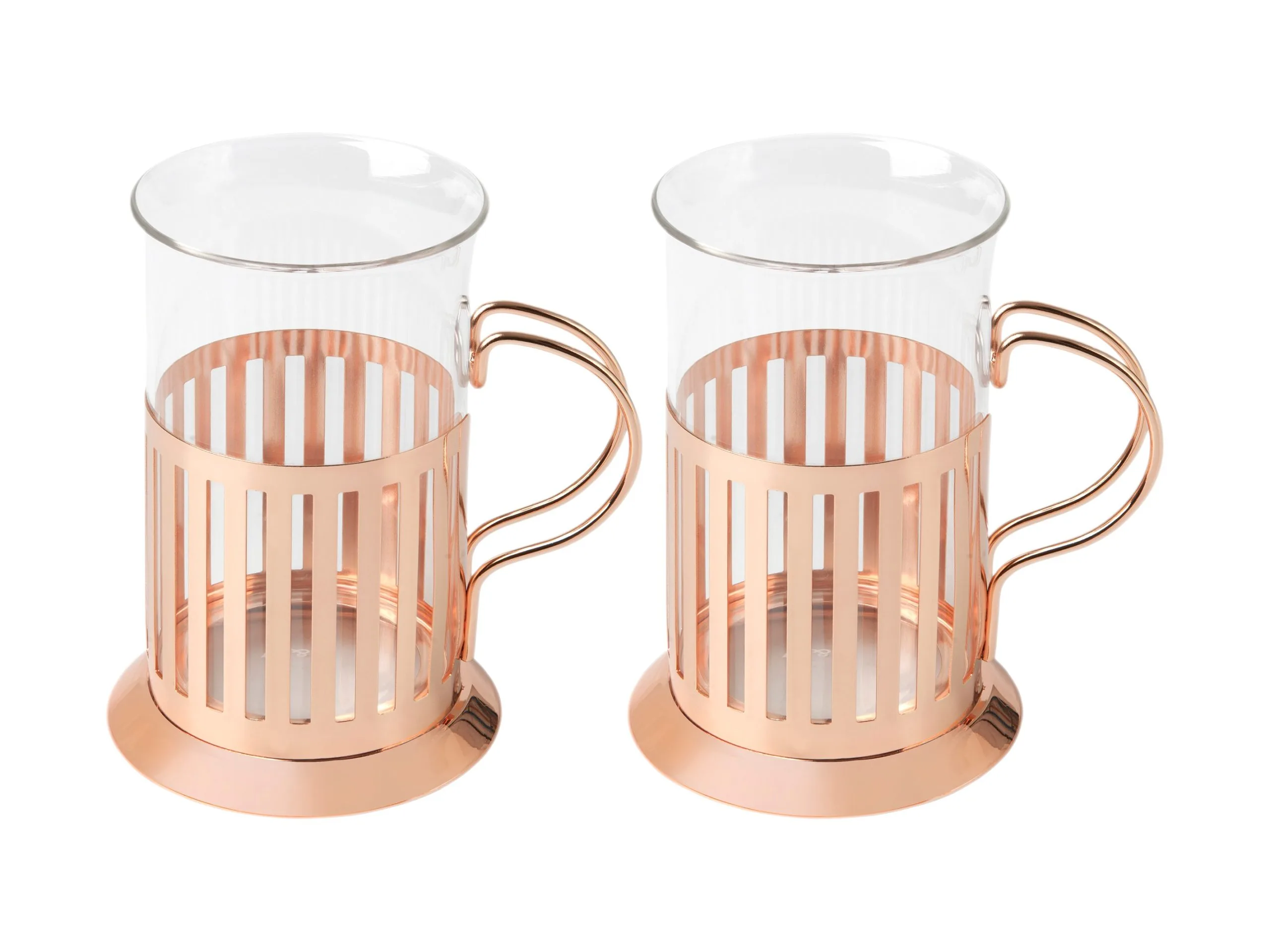 Start your day with the shine of rose gold. This set of two Colombia glass coffee mugs features durable borosilicate glass beakers and stainless steel frames with a luxurious rose gold finish. With a slender shape and an elegant flared lip, they bring a touch of European style to your morning brew. Each set of two comes beautifully gift boxed – a wonderful way to treat any coffee lover.